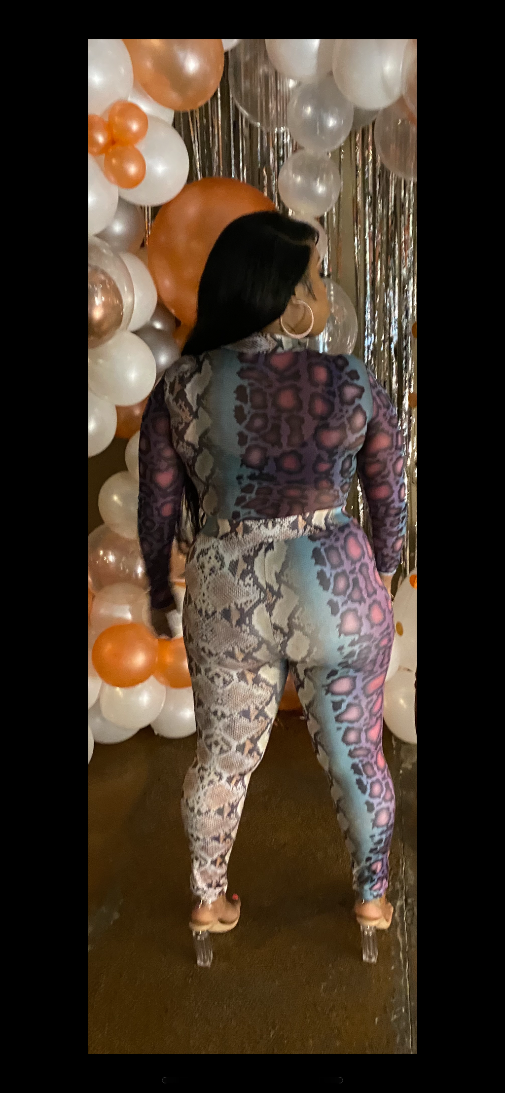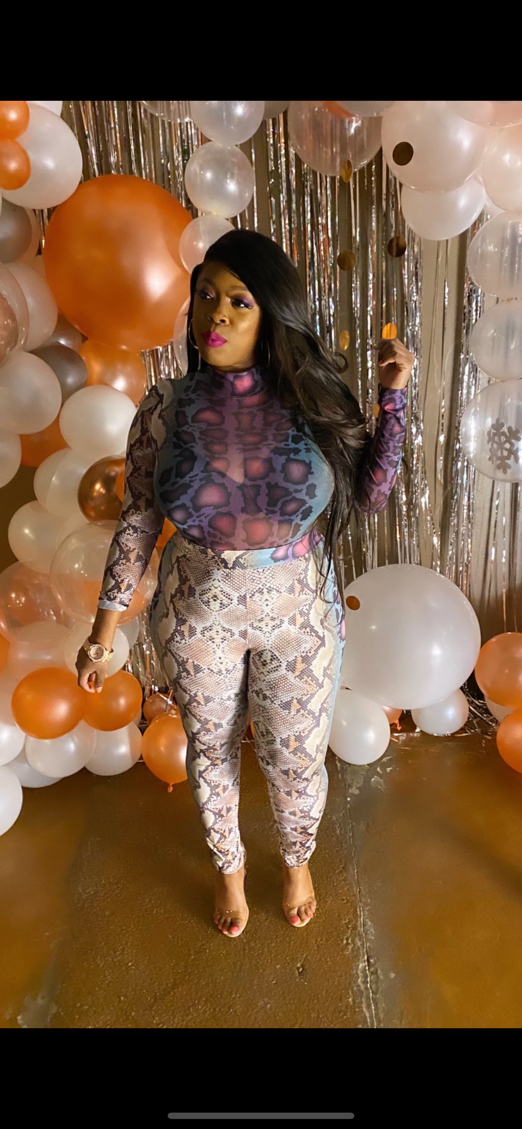 Mesh print bodysuit with leggings set. Model is wearing a Large. It has great stretch